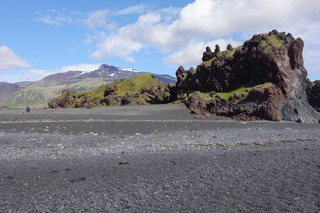Sören und Joceline am Strand Djúpalónssandur, im Hintergrund der Vulkan Snæfellsjökull mit Gletscher