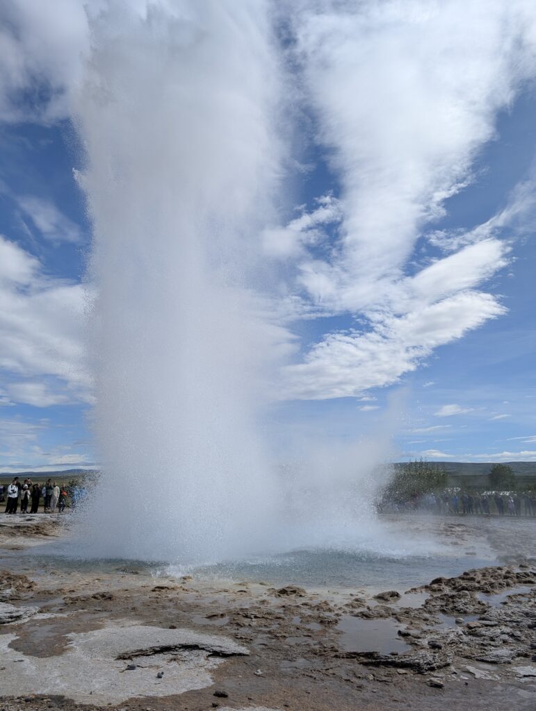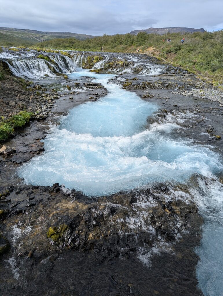 Der isländische Sommer ist kühl  und auf den Straßen ist es meist leer, kaum Gegenverkehr, mehr Schafe und Islandpferde als Menschen in der Weite verstreut. Eine karge Landschaft mit schroffem Vulkangestein, dass von weichem Islandmoos bedeckt ist. Man kann darauf so angenehm sitzen und alte Vulkane mit Gletscherkuppen in der Ferne betrachten. Aber an den Attraktionen stapeln sich die Touristen, ausgespien von Busherden und Mietautos mit bunten Bildern. Wo kommen die plötzlich alle her? Befremdlich finde ich die, die nicht selbst hier zu seien scheinen, sondern nur mit Smartphone oder Tablet alles zu archivieren versuchen und den echten Moment verpassen. Die Dame im Hot Pot am schönen See sitzt mit Handy in den verschiedenen Becken, nicht im Hier und Jetzt, stattdessen starrt sie auf den Bildschirm. Wegen der geothermischen Aufwärmung sind die Becken zahlreich und diese sind meistens komplett draußen.  Dennoch finde ich das Schwimmbad fußläufig zu unserer Unterkunft am angenehmsten, wo eine Isländerin genau drauf achtet, dass man vor dem Baden nackt duscht und sich abseift. Die älteren Damen schwimmen mit Wollmütze unter der Badekappe. Es ist Anfang August und sommerliche 10,4°C lassen mich beim Erklimmen der Rutsche zittern, doch das ist eine Badewannenrutsche, die so heißen muss, da das Wasser einen so wohlig warm wie in der Badewanne in Empfang nimmt. Die Becken sind in 4°C-Schritten bis 44°C wählbar, da kann man schon sein eigenes Süppchen kochen. Sauna und Gufubad (das Dampfbad) sind auch noch zum Durchwärmen verfügbar.